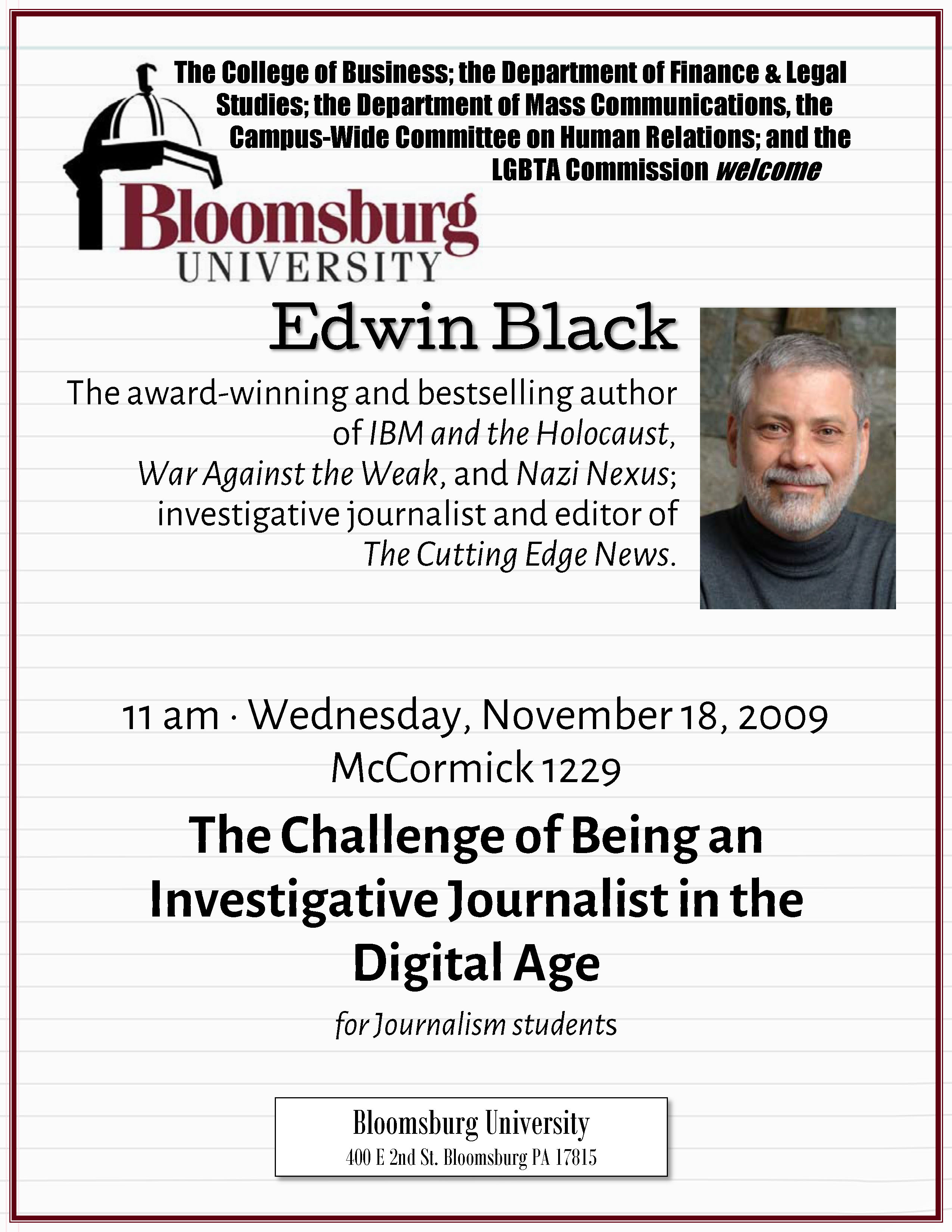 Sponsored by Bloomsburg University College of Business and Department of Finance & Legal Studies, Department of Mass Communications, the Campus Wide Committee on Human Relations, and the LGBTA Commission; co-sponsored by the State of California Center for the Study of the Holocaust, Genocide, Human Rights and Tolerance, the Binghamton Social Justice Fund, Technology and Justice Fund, & History Network News, the Institute for Religion and Public Policy, Jewish Virtual Library, The Daily Estimate, Energy Publisher, The Auto Channel, Spero Forum, and The Cutting Edge News