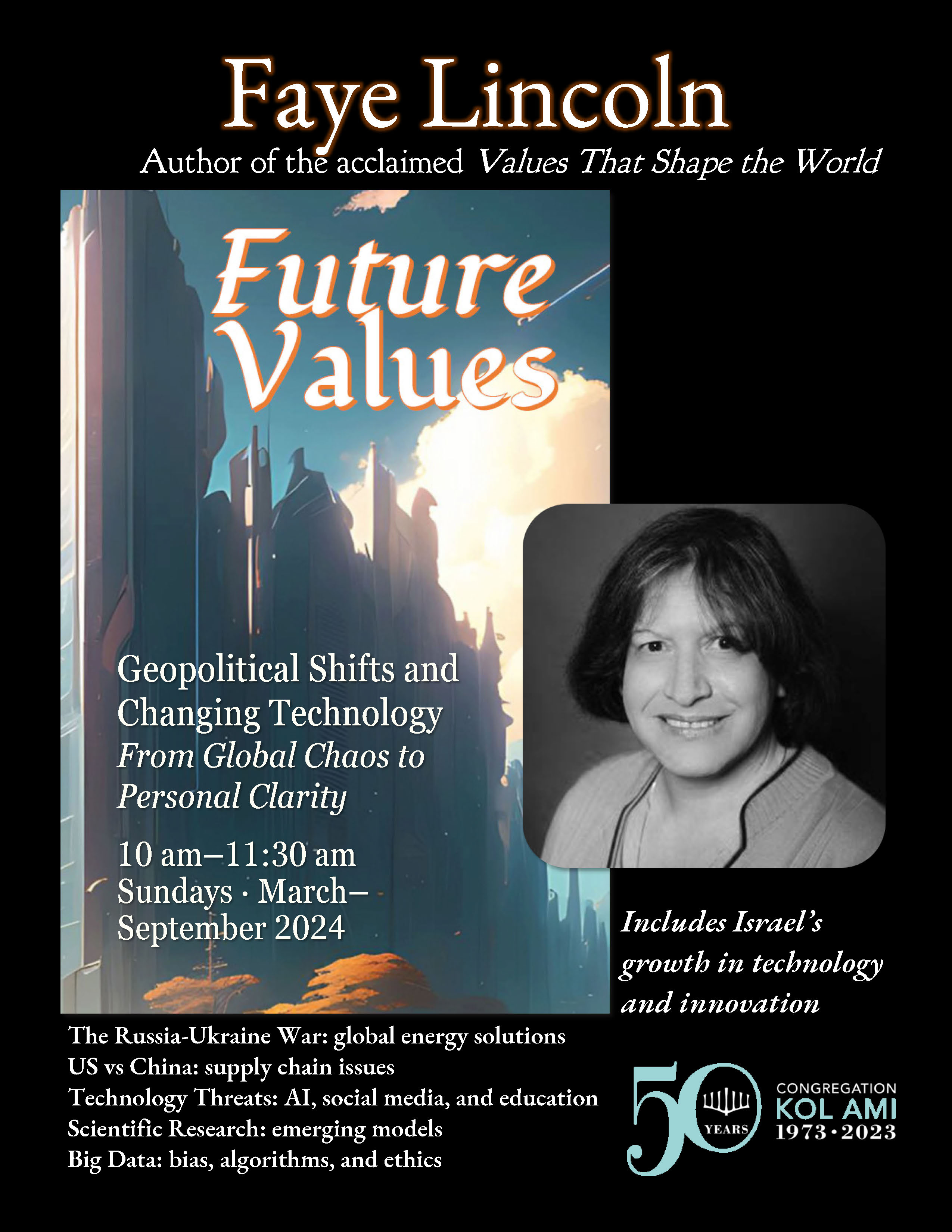 Faye Lincoln presents a Future Values series for Congregation Kol Ami, Sundays from 10 am–11:30 am (with snacks at 9:30 am), with the first on Sunday, March 10, 2024.