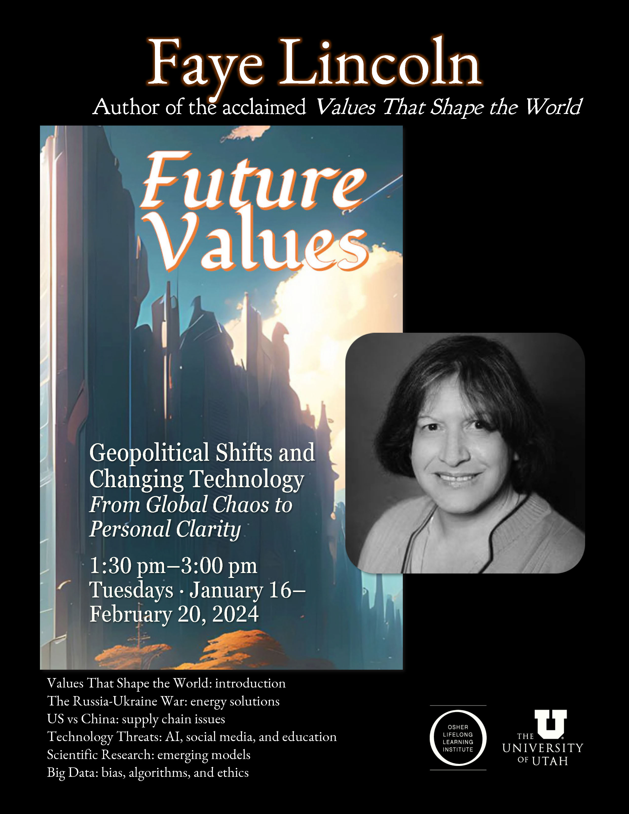 Faye Lincoln presents a Future Values series for OSHER Utah, Tuesdays from 1:30 pm–3 pm beginning January 16, 2024.